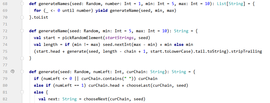 Wanting to take a fresh approach to this project, I decided to not look into others' solutions. My initial program was a simple algorithm that alternated between random sets of consonants and vowels before choosing a randomized ending. However, as you can imagine, it would often generate barely-pronounceable names. Thus, I became aware of the need to research what others had done before.